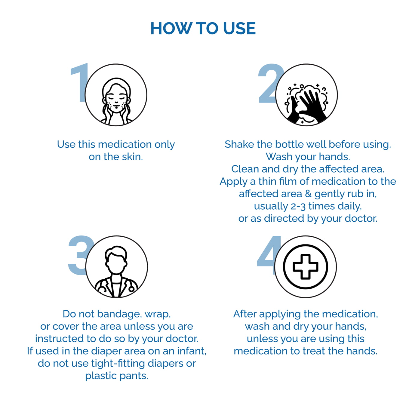 Shake the bottle well before using. Wash your hands. Clean and dry the affected area.