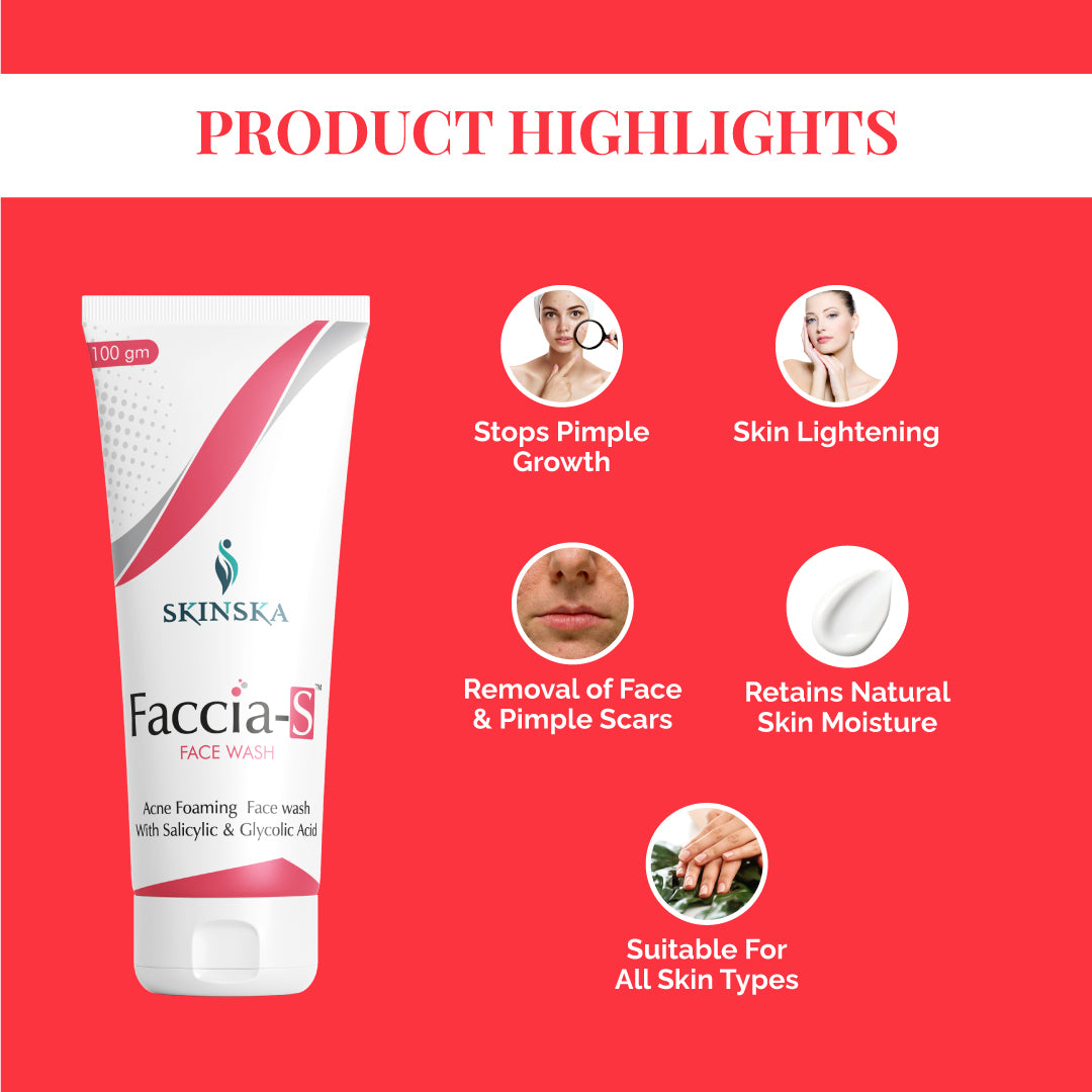 Faccia-S Anti -Acne face wash with salicylic acid and glycolic acid is used to treat mild to moderate acne. It may be used in combination with other acne treatments. Consult your doctor or pharmacist first before combining acne treatments.