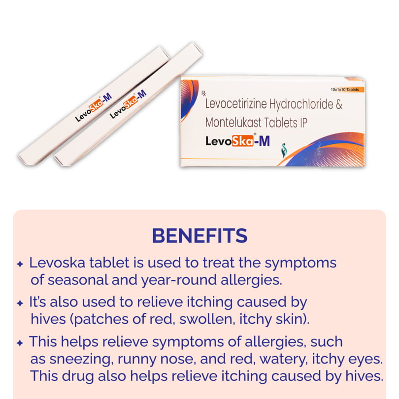 1. Enhanced allergy symptom relief: Combining levocetirizine (an antihistamine) with montelukast (a leukotriene receptor antagonist) can provide more comprehensive symptom relief by targeting different pathways involved in allergic reactions. Montelukast works by reducing inflammation and swelling in the airways, helping to alleviate symptoms such as wheezing, coughing, and shortness of breath.