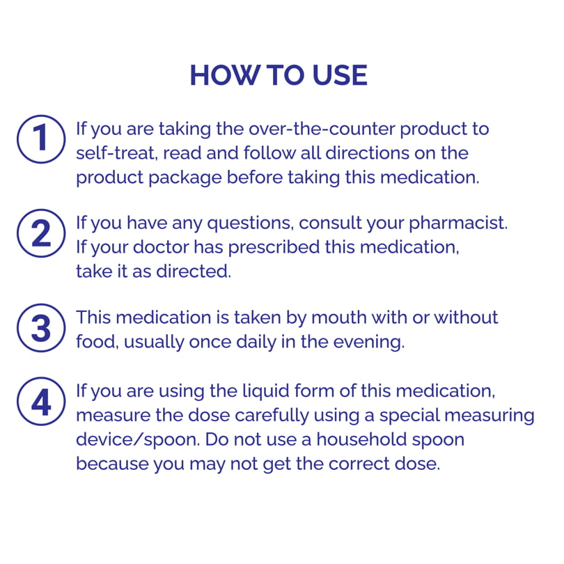 This medication is taken by mouth with or without food, usually once daily in the evening.