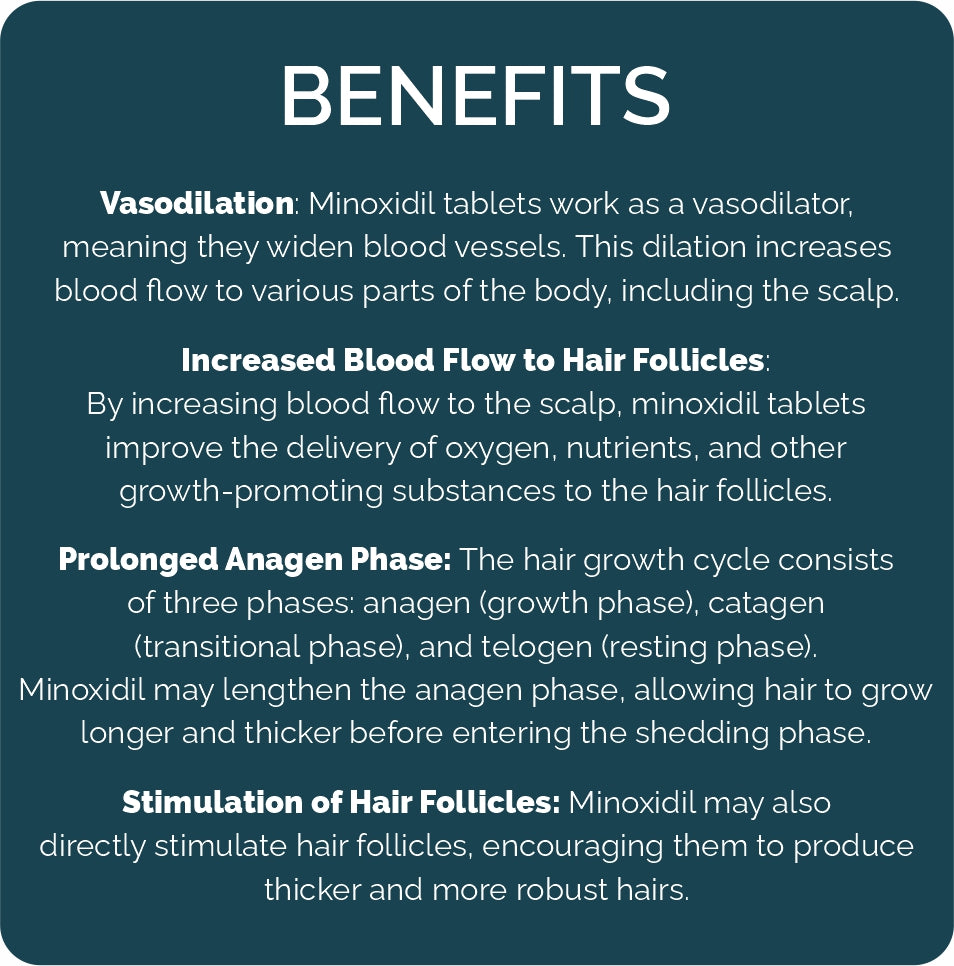 1. Vasodilation: Minoxidil tablets work as a vasodilator, meaning they widen blood vessels. This dilation increases blood flow to various parts of the body, including the scalp.